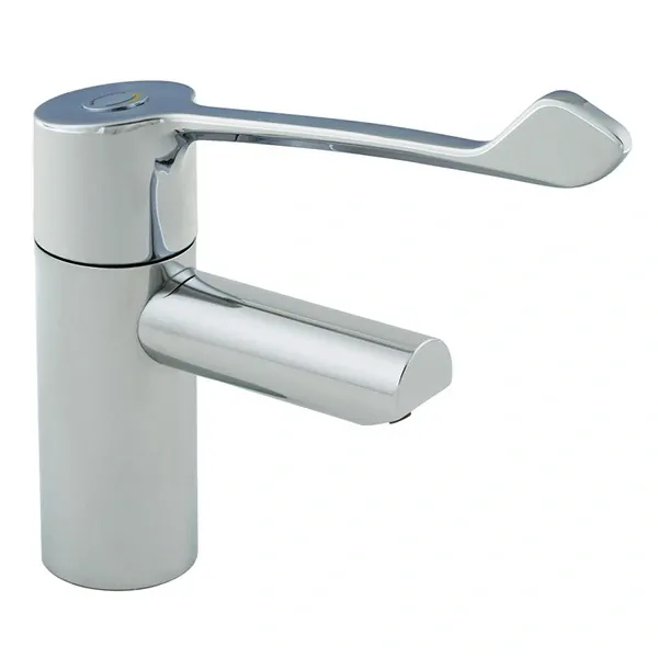This innovative lead free Galvin CliniMix® point of use thermostatic progressive mixer provides state-of-the-art safety features to comply with the latest healthcare requirements. The single lever operates on/off temperature control for straight forward operation simplifying hand wash procedures. The long arm is operated handsfree with elbows to avoid hand contact or cross-contamination. Suitable for high and low pressure systems it can be set to deliver a thermostatically controlled water temperature up to 48ºC maximum.