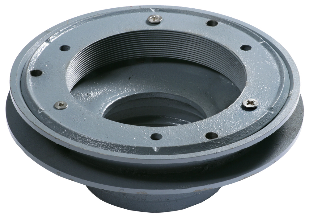 Ductile iron grey enamel coated Multi-Purpose vertical built-in puddle flange body, with dual purpose reversible membrane clamping collar with weep holes and stainless steel lock down bolts.
