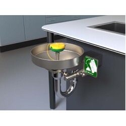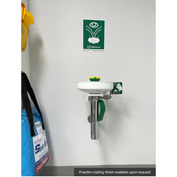 GalvinSafe® wall-mounted eye/face wash shall include a stainless steel 279mm round bowl, an AXION® MSR Head & SS Bowl with inverted directional laminar flow which achieves Zero Vertical Velocity™ supplied by an integral 11.4 lpm flow control, and type 316 stainless steel ball valve equipped with stainless steel ball and stem. Unit shall also include a type 304 stainless steel in-line 50 x 50 mesh water strainer and wall bracket, yellow plastic dust cover, universal sign, 1/2" BSPP(F) inlet, and 1-1/4" BSPT(M) waste.