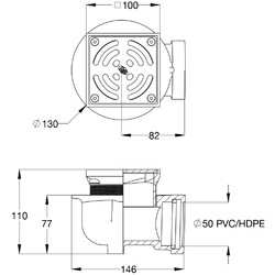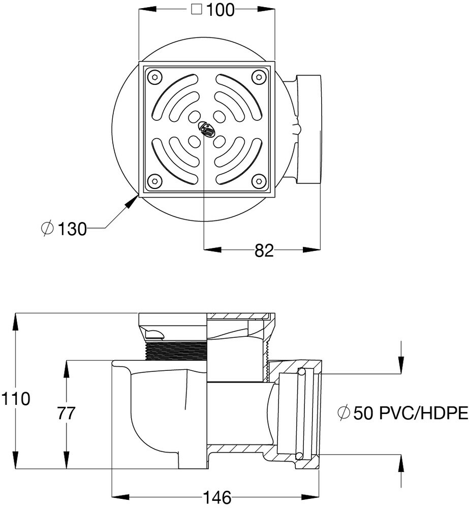 Cast stainless steel square drain assembly, threaded BSP, with three stainless steel lock down allen key screws for grate, machined/linished surface, load rated to Class B, with grey enamel coated cast iron shallow horizontal body, three weep holes.