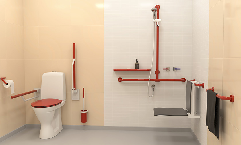 - Handrails and grab rails clearly visible against walls