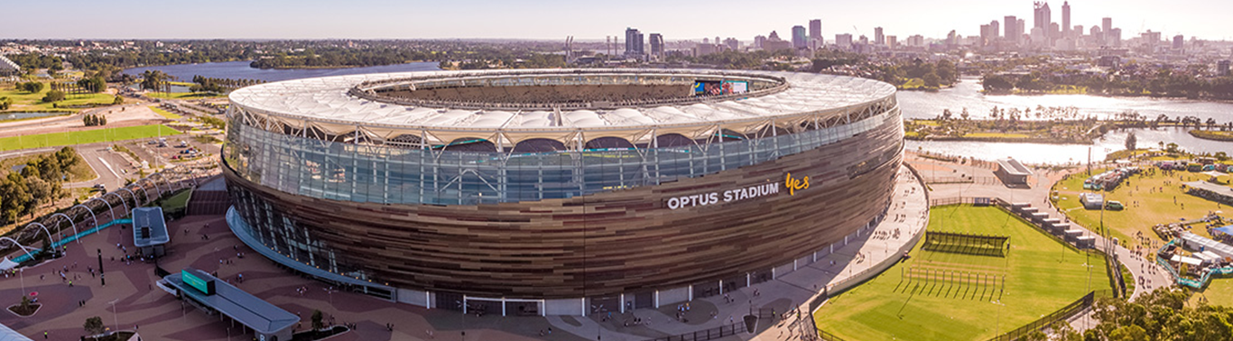 Voted “Most Beautiful Sports Facility in the World” in the Prix Versailles 2019 international architecture awards, Optus Stadium proudly shines through its unique bronze anodised aluminium façade and customisable LED lighting.