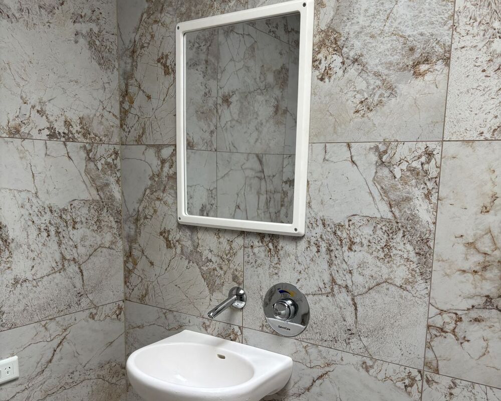 Our range of Wallgate ligature- and vandal resistant mirrors are available in a range of sizes. The solid surface frame is made as one single piece and encapsulates a tough, high grade scratch-resistant polycarbonate mirror.