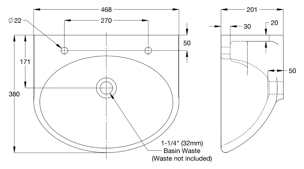 • SHB-05W-LRT Wallgate Wash Hand Basin Solid Surface Front Fixed Exposed Services 2TH